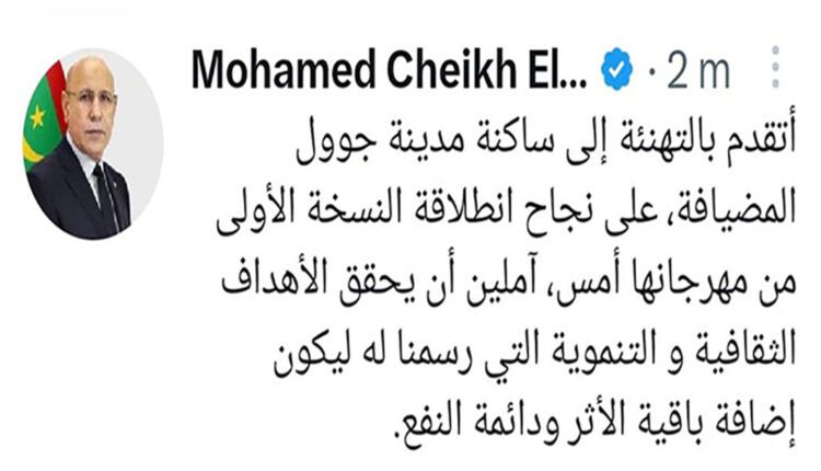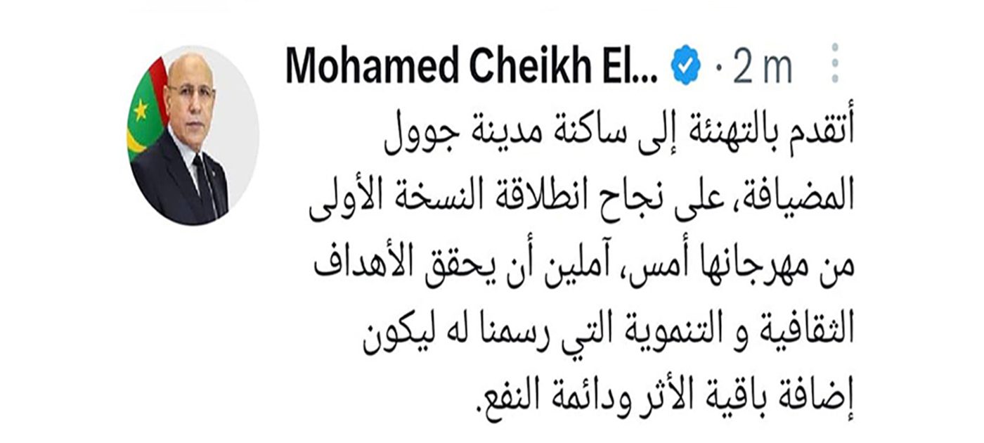 هنأ فخامة رئيس الجمهورية السيد محمد ولد الشيخ الغزواني ساكنة مدينة جوول المضيافة، على نجاح انطلاقة النسخة الأولى من مهرجانها أمس.
