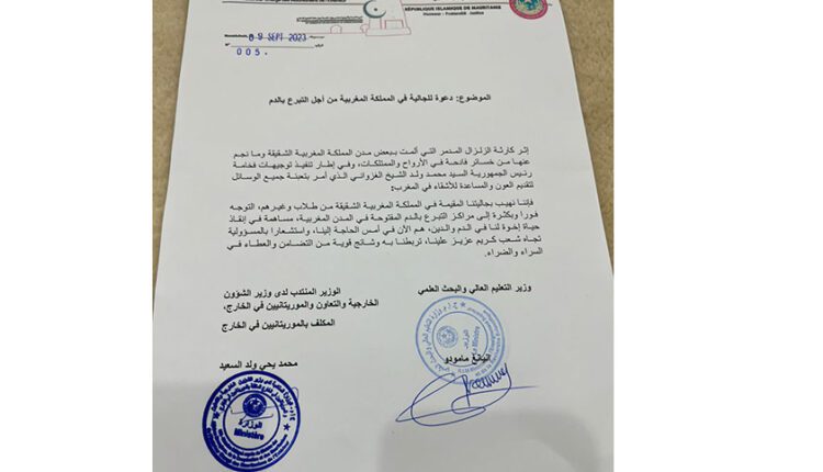 وجاء في البيان الذي أصدرته الوزارتان، أن هذه الدعوة التي تأتي في إطار تنفيذ توجيهات فخامة رئيس الجمهورية، السيد محمد ولد الشيخ الغزواني، الذي أمر بتعبئة جميع الوسائل لتقديم العون والمساعدة للأشقاء في المغرب، تشكل مساهمة في إنقاذ حياة إخوة لنا في الدم والدين هم الآن في أمس الحاجة إلينا.