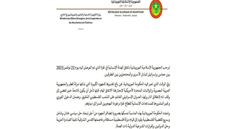 “ترحب الجمهورية الإسلامية الموريتانية باتفاق الهدنة الإنسانية في غزة الذي تم التوصل إليه يوم 22 نوفمبر 2023 بين حماس وإسرائيل لتبادل الأسرى والمحتجزين بين الطرفين.