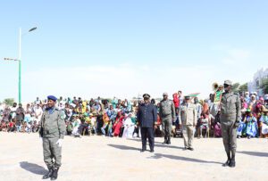 واستعرض السيد الوالي، رفقة قائد الكتيبة 52 محمولة المقدم محمد محمد لبات فرجو، وحدات من الجيش والدرك والحرس الوطنيين قبل أن يصافح المنتخبين ورؤساء المصالح الجهوية وقادة الأجهزة الامنية والعسكرية على مستوى الولاية.