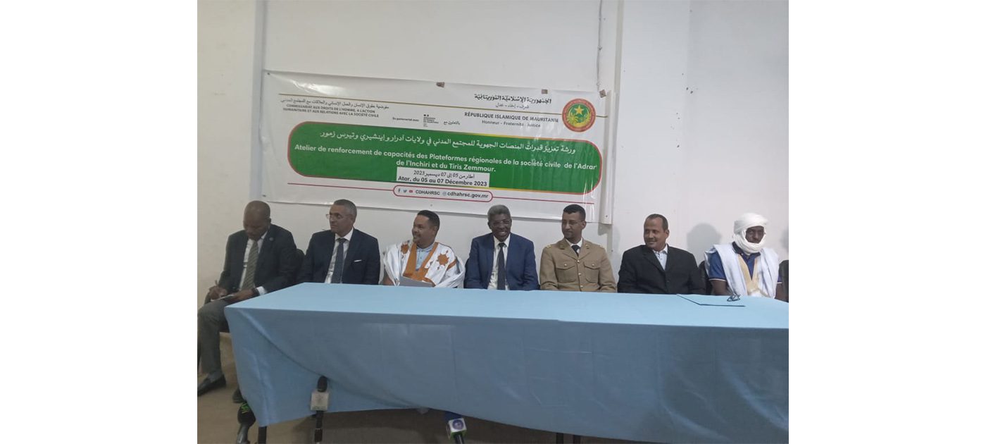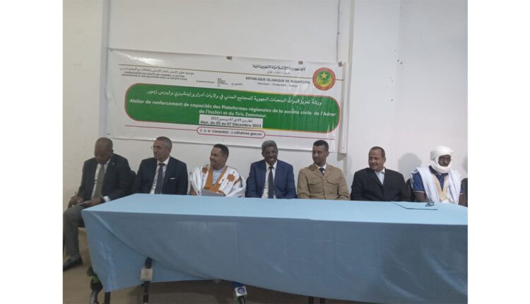 اشرف مستشار والي آدرار المكلف بالشؤون السياسية والاجتماعية السيد محمد ولد سيد احمد ولد اعل اليوم الثلاثاء في مدينة اطار علي افتتاح ورشة تعزيز قدرات المنصات الجهوية للمجتمع المدني في ولايات آدرار وانشيري وتيرس زمور.