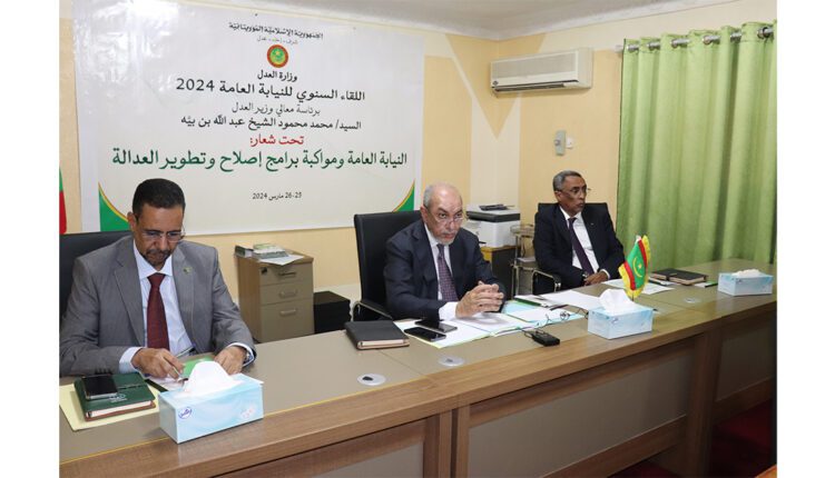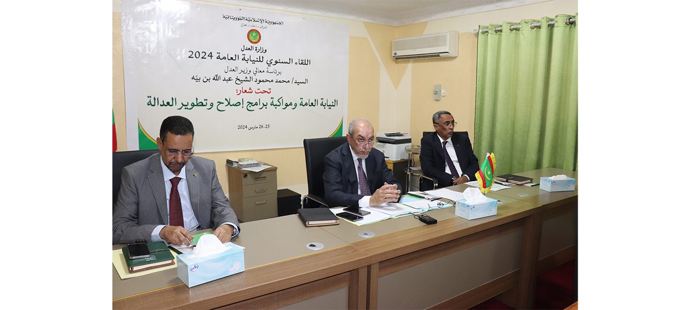 ترأس معالي وزير العدل السيد محمد محمود بن الشيخ عبد الله بن بيةصباح اليوم الاثنين بمقر مكتب تسيير الممتلكات المجمدة والمحجوزة والمصادرة وتحصيل الأصول الجنائية في نواكشوط، اللقاء السنوي للنيابة العامة تحت شعار ” النيابة العامة ومواكبة إصلاح وتطوير العدالة”.