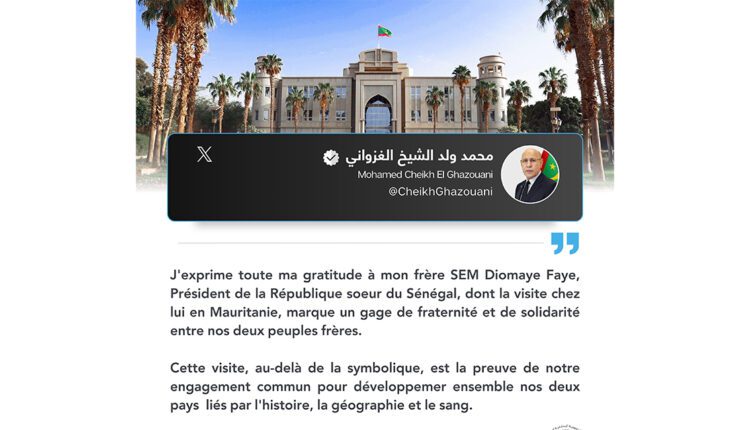 وكتب فخامته على حسابه في منصة (X): “أعرب عن بالغ امتناني لأخي صاحب الفخامة السيد باسيرو ديوماي فاي، رئيس جمهورية السنغال الشقيقة، الذي تمثل زيارته لموريتانيا ضمانا لتعزيز الأخوة والتضامن بن شعبيا الشقيقين.