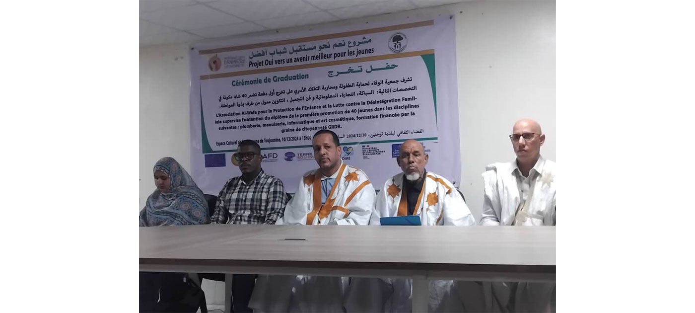 نظمت جمعية الوفاء لحماية الطفولة ومحاربة التفكك الأسري اليوم الثلاثاء في الفضاء الثقافي لبلدية توجنين بنواكشوط الشمالية حفل تخرج 40 شابا وشابة، تم تكوينهم في مهن مختلفة.
