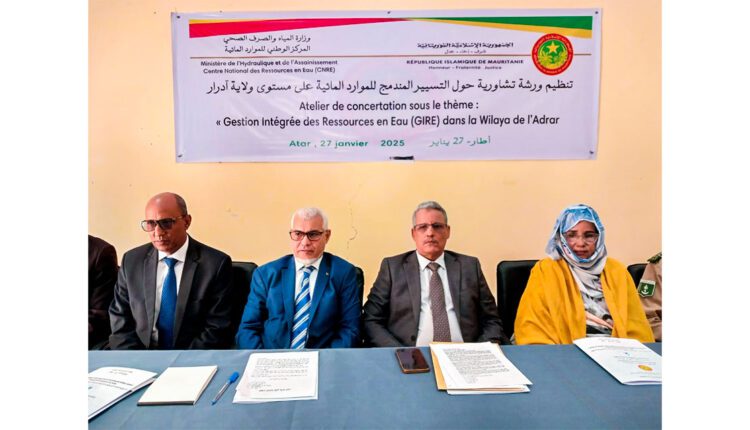أشرف والي آدرار، السيد عبد الله ولد محمد محمود، صباح اليوم الاثنين بمدينة أطار، صحبة مدير المركز الوطني للموارد المائية، السيد محمد الأمين ولد خطري، على افتتاح أشغال ورشة تشاورية حول التسيير المندمج للموارد المائية على مستوى الولاية.