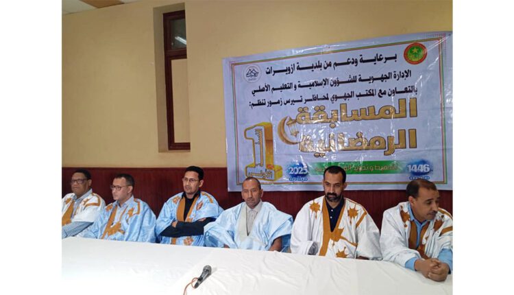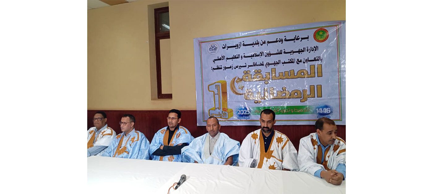 أشرف والي تيرس الزمور السيد الطيب ولد محمد محمود الليلة البارحة، بمدينة ازويرات، على حفل اختتام النسخة الأولى من المسابقة الرمضانية لحفظ وتجويد القرآن الكريم، المنظمة من طرف الإدارة الجهوية للشؤون الإسلامية والتعليم الأصلي، بالتعاون مع المكتب الجهوي لمحاظر تيرس الزمور، وبرعاية ودعم من بلدية ازويرات.