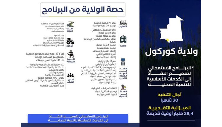 ويبلغ الغلاف المالي المخصص لتمويل المشاريع التنموية ذات الأولوية في الولاية ضمن هذا البرنامج 28,4 مليار أوقية قديمة، سيتم توجيهها لتنفيذ مجموعة من المشاريع التنموية في عدة قطاعات خدمية هامة، كالتعليم والصحة والمياه والكهرباء والزراعة والتنمية الحيوانية، فضلا عن فك العزلة وتمكين الشباب.