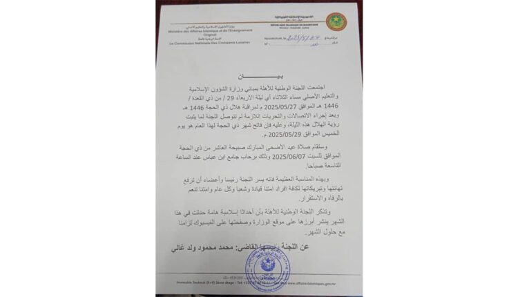 وبناءً على ذلك، تقرر أن يكون الخميس 29 مايو هو فاتح شهر ذي الحجة، وعليه فإن صلاة عيد الأضحى المبارك ستُقام صبيحة يوم السبت 7 يونيو 2025، عند تمام الساعة التاسعة صباحاً برحاب جامع ابن عباس في نواكشوط.