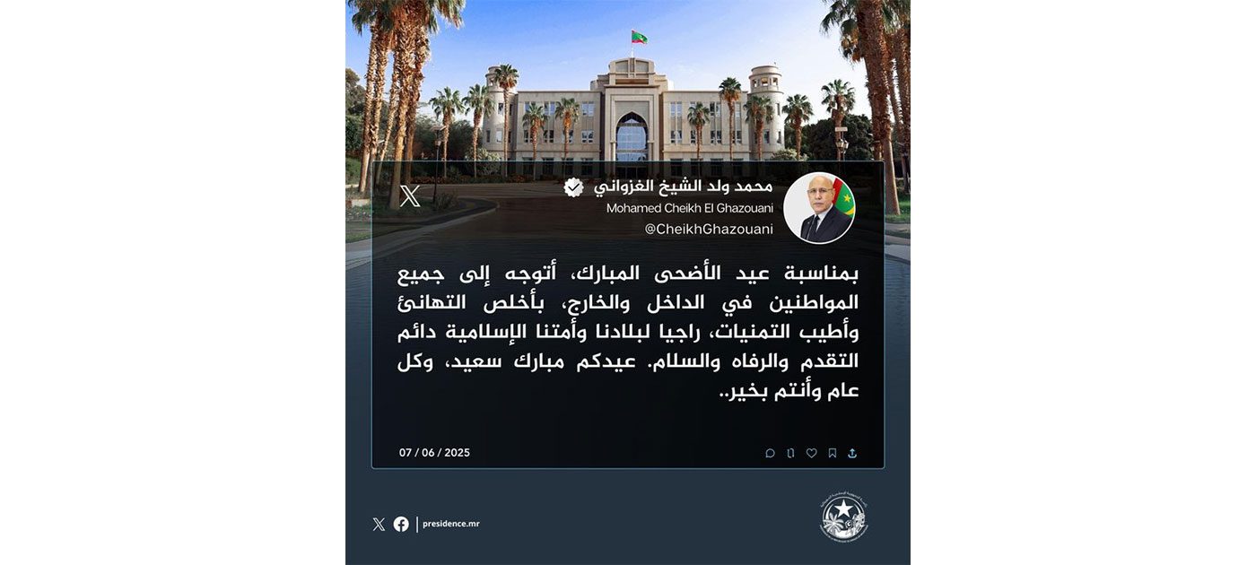 هنأ فخامة رئيس الجمهورية، السيد محمد ولد الشيخ الغزواني، جميع المواطنين في الداخل والخارج، بمناسبة عيد الأضحى المبارك.