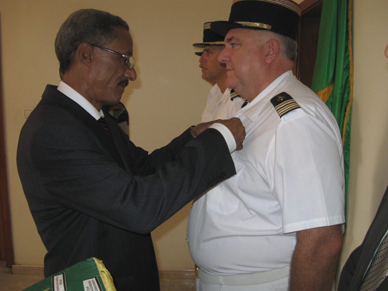 وشمل هذا التوشيح الذى جرى بحضور اللواء احمد ولد بكرن، الأمين العام لوزارة الدفاع الوطني، المقدم افيليب بارو، ملحق عسكري، رئيس بعثة التعاون العسكري الفرنسي في موريتانيا، بوسام ضابط في نظام الاستحقاق الوطني.