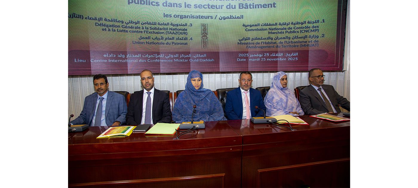 نظمت اللجنة الوطنية لمراقبة الصفقات العمومية، بالشراكة مع قطاعات الإسكان والعمران والاستصلاح الترابي، والمندوبية العامة للتضامن الوطني ومكافحة الإقصاء (التآزر)، والاتحاد العام لأرباب العمل الموريتانيين، يوما مفتوحا للتبادل والتفكير حول الصفقات العمومية في قطاع البناء.