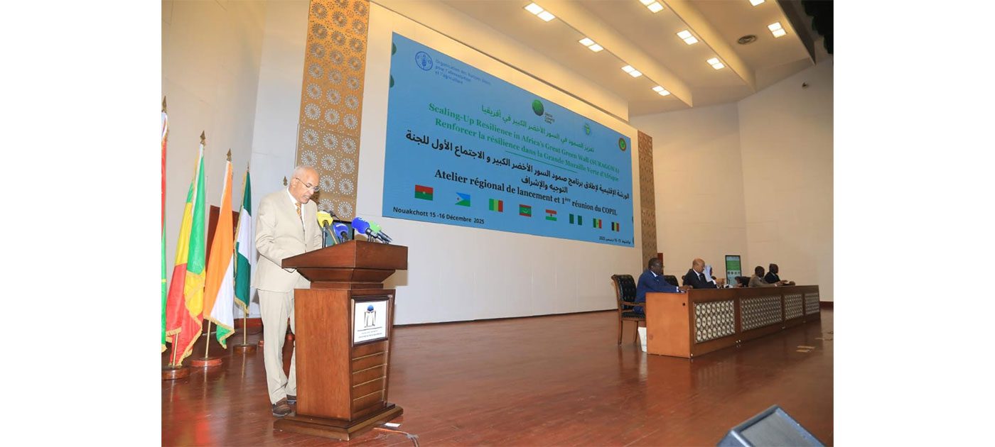 أشرف المستشار القانوني لوزارة البيئة والتنمية المستدامة السيد صلاح الدين عباس، الامين العام وكالة، اليوم الاثنين في نواكشوط، على افتتاح الورشة الجهوية لإطلاق مشروع تعزيز الصمود لمبادرة السور الأخضر الكبير الهادف إلى دعم الأمن البيئي وتعزيز التنمية المستدامة في منطقة الساحل.