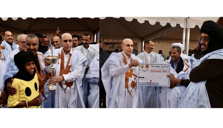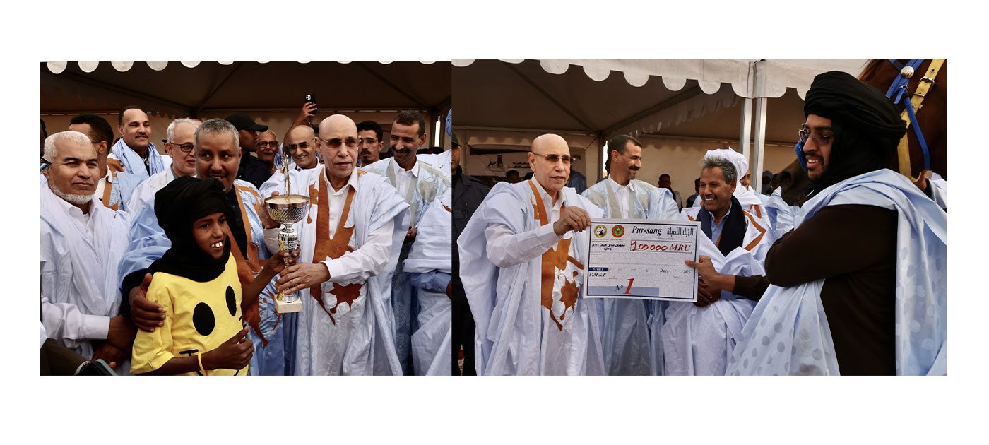 وسلم فخامة رئيس الجمهورية الجائزة الأولى للفائز الأول من الخَيَّالة محمد عمرو الفتح، وللفائز الأول من الجمَّالة أمربيه ولد الشيخ ماء العينين.
