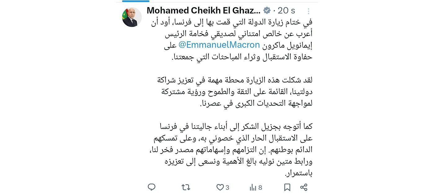 أعرب فخامة رئيس الجمهورية، السيد محمد ولد الشيخ الغزواني، عن خالص امتنانه لصديقه فخامة الرئيس الفرنسي إيمانويل ماكرون، على حفاوة الاستقبال وثراء المباحثات التي جمعتهما خلال زيارة الدولة التي قام بها إلى فرنسا، مؤكدا أن الزيارة شكلت محطة مهمة في تعزيز الشراكة بين البلدين.