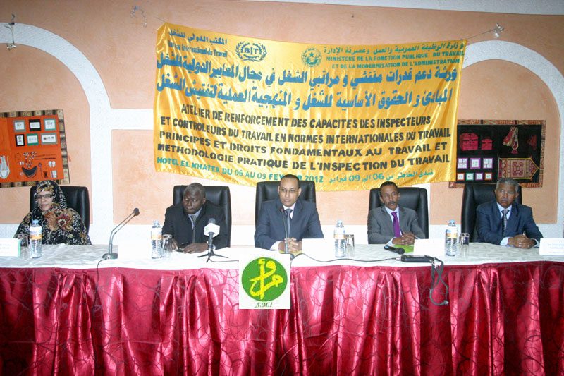 أشرف الأمين العام لوزارة الوظيفة العمومية والعمل وعصرنة الادارة الدكتور محمد ولد اشريف أحمد، صباح اليوم الاثنين في نواكشوط على افتتاح ورشة لتدعيم “قدرات مفتشي ومراقبي الشغل في مجال المعايير الدولية للشغل تحت شعار (المبادئ والحقوق الأساسية للشغل والمنهجية العلمية للتفتيش) منظمة من طرف الوزراة بالتعاون مع المكتب الدولي للشغل.