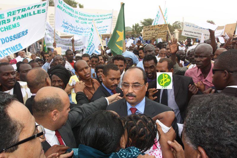 استقبل رئيس الجمهورية السيد محمد ولد عبد العزيز مساء اليوم الاثنين أمام القصر الرئاسي في نواكشوط ، تظاهرة تأييد ومساندة نظمها المتقاعدون من القوات المسلحة وقوات الأمن ومنتسبي الصندوق الوطني للضمان الاجتماعي.