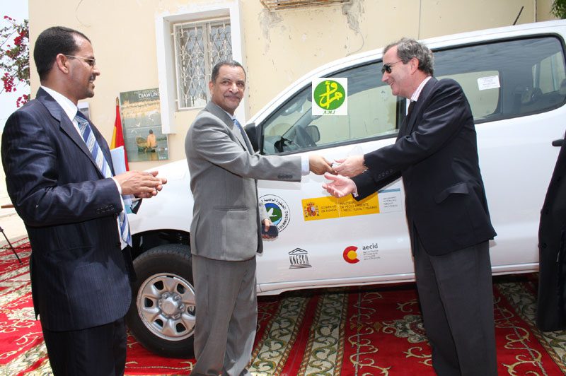 تسلم الأمين العام للوزارة المنتدبة لدى الوزير الأول المكلفة بالبيئة والتنمية المستدامة السيد محمد يسلم ولد محمد الأمين اليوم الأربعاء سيارة رباعية الدفع اقتنتها الهيئة المستقلة للمحميات الوطنية الإسبانية التابعة لوزارة البيئة الإسبانية في إطار برنامج الإنسان ومحيطه الحيوي التابع لليونسكو ومعدات وتجهيزات لدعم القدرات الفنية للحظيرة الوطنية لجاولينغ في مجال المراقبة والتسيير البيئة.