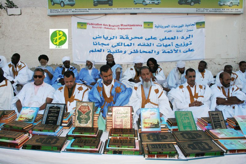 وزعت اتحادية البورصات الموريتانية مساء اليوم الثلاثاء بمقرها 500 كتاب من أمهات الفقه المالكي مجانا على طلبةالمحاظر وطلبة العلم استفاد منها 70 طالب محظرة.