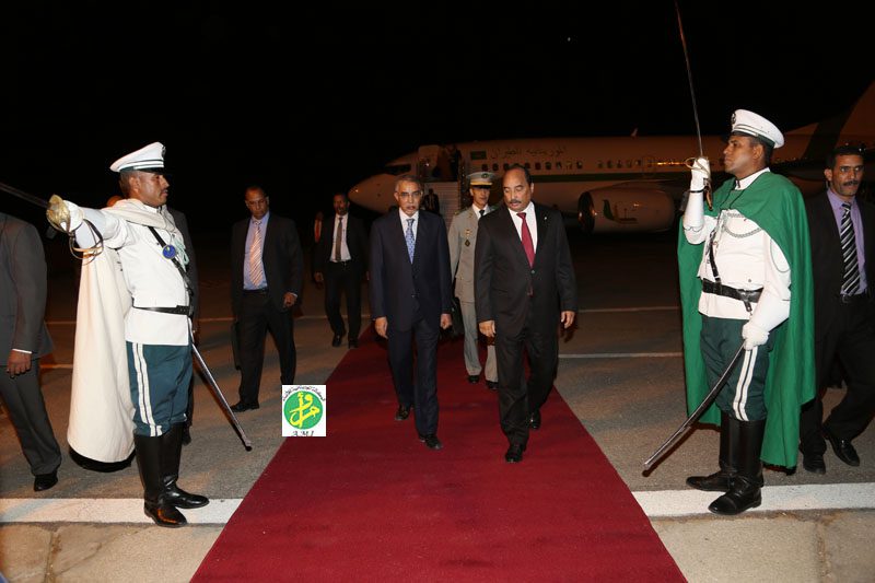 واستقبل رئيس الجمهورية بالمطار من طرف الوزير الاول السيد يحي ولد حدمين وعدد من أعضاء الحكومة وقائد الاركان الخاصة لرئيس الجمهورية ووالي نواكشوط الغربية ورئيسة مجموعة نواكشوط الحضرية.