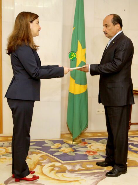 تسلم رئيس الجمهورية السيد محمد ولد عبد العزيز صباح اليوم الثلاثاء بالقصر الرئاسي في نواكشوط أوراق اعتماد سعادة السيدة ناتالي ديبي، بصفتها سفيرة فوق العادة وكاملة السلطة لكندا لدى الجمهورية الإسلامية الموريتانية.