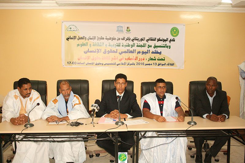 وأضاف أن نادي اليونسكو الثقافي الموريتاني قد حرص طيلة العشرية المنصرمة على تخليد ذكرى اليوم العالمي لحقوق الإنسان من خلال تناول أهم الإشكالات المرتبطة بها وطنيا ومن زاوية اهتمام الشباب، الذين يعتبرون رهانا حقيقيا في نشر الوعي بثقافة حقوق الإنسان، وتنمية روح الديمقراطية والمواطنة التي هي البيئة الحاضنة والمنمية للثقافة الحقوقية.