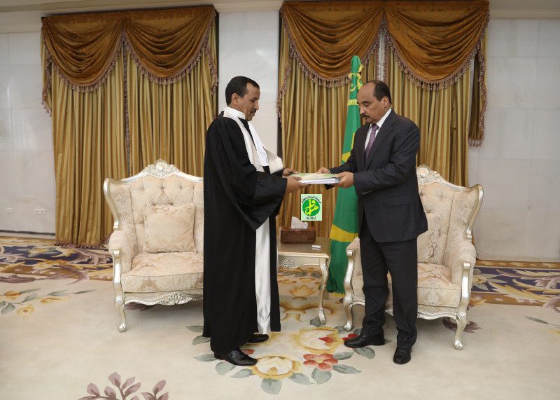 ” لقد تشرفت بلقاء فخامة رئيس الجمهورية السيد محمد ولد عبد العزيز وكان ذلك بمناسبة تسليم التقرير السنوي العام لمحكمة الحسابات لفخامته والذي يتضمن أهم الملاحظات والتوصيات الناتجة عن المهام الرقابية المنفذة خلال السنوات 2010-2011-2012؛ وذلك طبقا للمادة 48 من القانون رقم 19/93 المتعلق بمحكمة الحسابات.