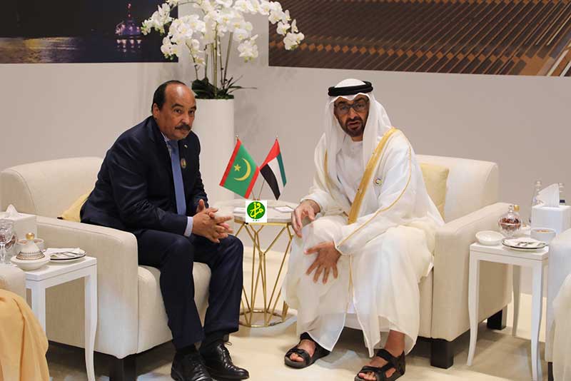 أجرى رئيس الجمهورية السيد محمد ولد عبد العزيز صباح اليوم الاثنين في أبوظبي على هامش حضور فعاليات أسبوع أبوظبي للاستدامة مباحثات مع صاحب السمو الشيخ محمد بن زايد آل نهيان، ولي عهد أبوظبي نائب القائد الأعلى للقوات المسلحة في دولة الامارات العربية المتحدة.